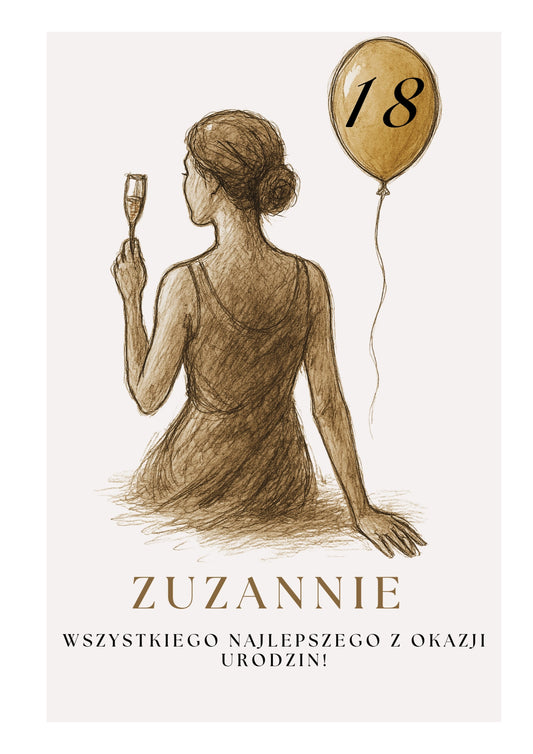 Personalizowany Plakat Urodzinowy z Postacią Kobiecą i Złotym Balonem – Stylowa Pamiątka na Każdy Wiek