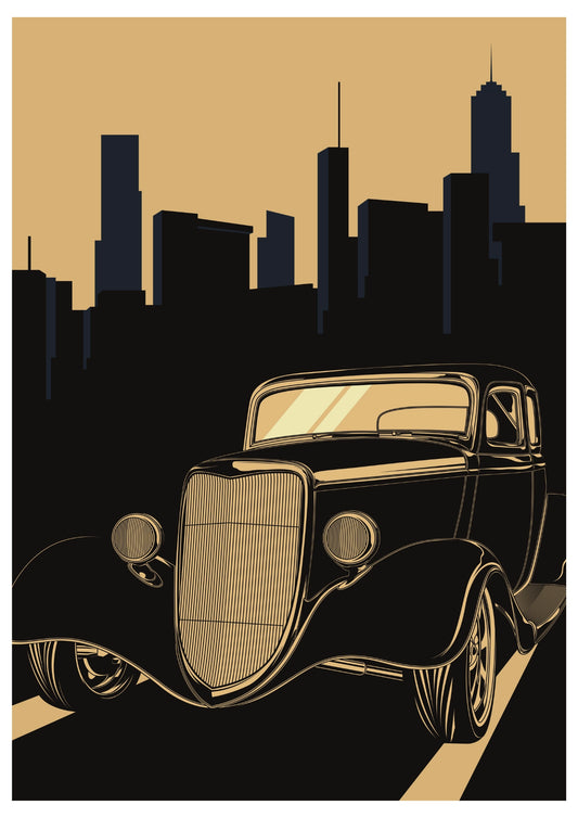 Klasyczny Samochód na Tle Metropolii – Plakat