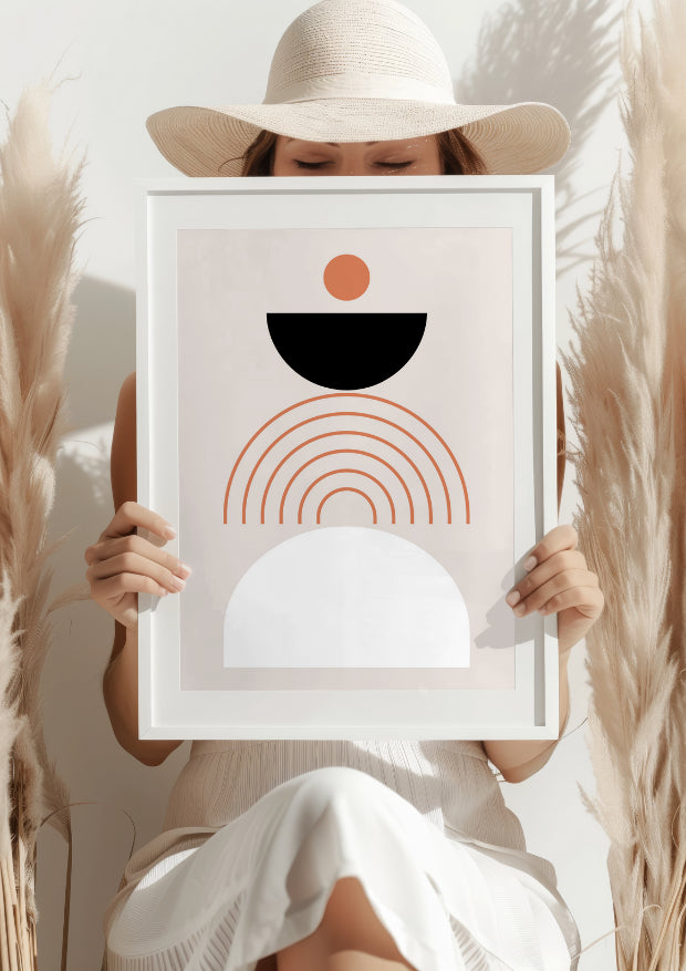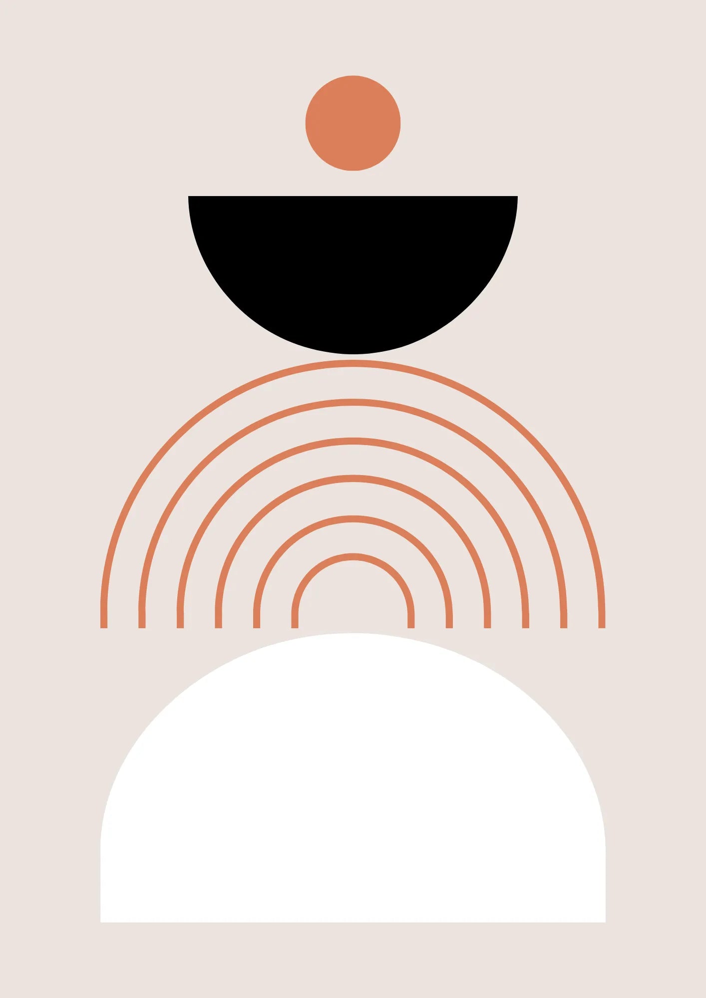Centralnym elementem plakatu są symetryczne łuki i okręgi, które tworzą zrównoważoną kompozycję, przyciągającą uwagę od pierwszego spojrzenia. Proste linie w połączeniu z kontrastowymi kolorami dodają całości elegancji, a jednocześnie dynamiki, czyniąc plakat idealnym wyborem dla tych, którzy cenią nowoczesny design.