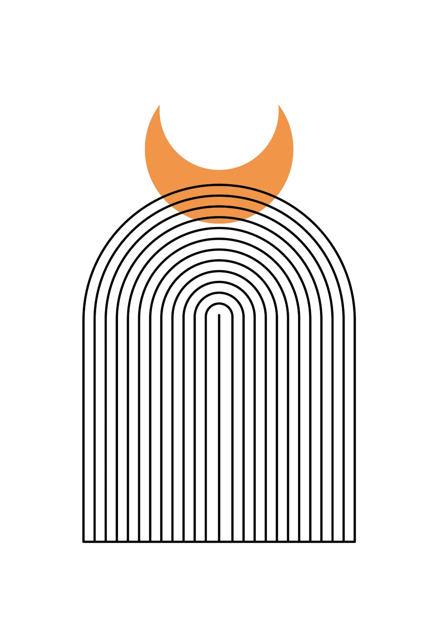 Ten plakat przyciąga wzrok subtelnym wizerunkiem półksiężyca unoszącego się nad minimalistycznym łukiem. W prostej formie tkwi elegancja – ciepły pomarańcz półksiężyca kontrastuje z precyzyjnymi, czarnymi liniami łuku, co tworzy wyjątkową harmonię i równowagę.Symbolika Kosmicznych Kształtów