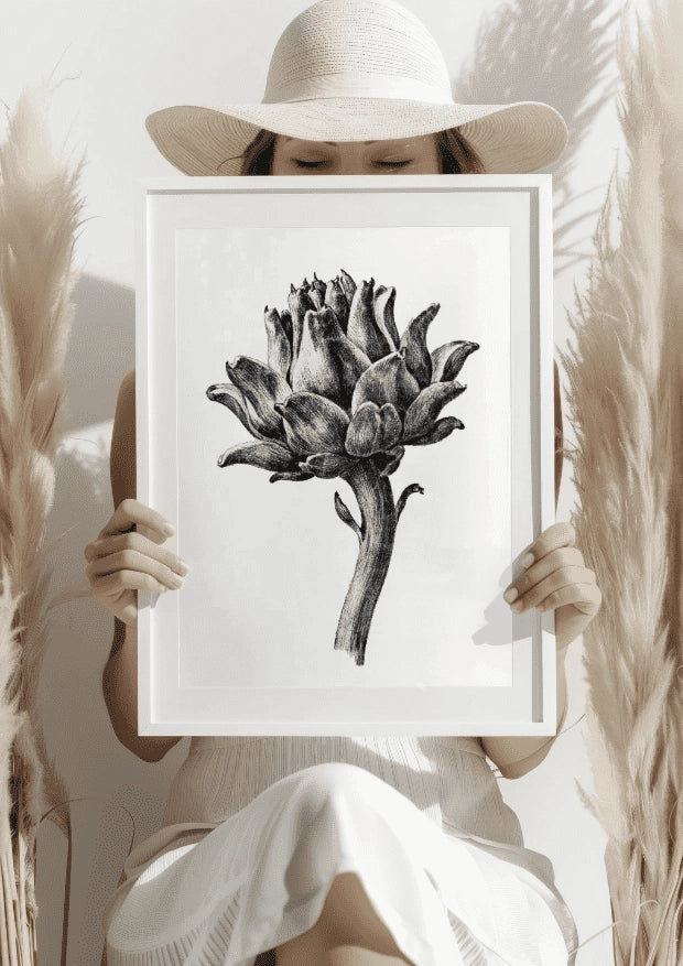 Ten plakat to kwintesencja minimalistycznej sztuki, przedstawiający kwiat w subtelnej, czarno-białej palecie. Każdy szczegół, od delikatnych linii płatków po teksturę łodygi, został starannie oddany, tworząc wrażenie ręcznie rysowanego dzieła. Idealny do przestrzeni, gdzie potrzebna jest delikatna, ale wyrazista dekoracja.