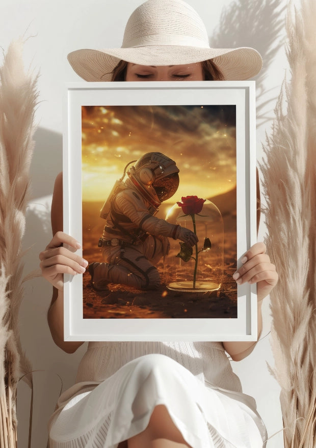 Zanurz się w szczegółach tego niezwykłego plakatu, gdzie mistrzowskie połączenie kolorów oddaje głębię przestrzeni kosmicznej i subtelność ziemskiego piękna. Każdy element, od lśniącego hełmu astronauty po delikatne płatki róży, został starannie opracowany, by oddziaływać na emocje i inspirować. Ten plakat to nie tylko dekoracja – to opowieść o nieograniczonej możliwości i potencjale.Zostań Odkrywcą Swojego Wnętrza