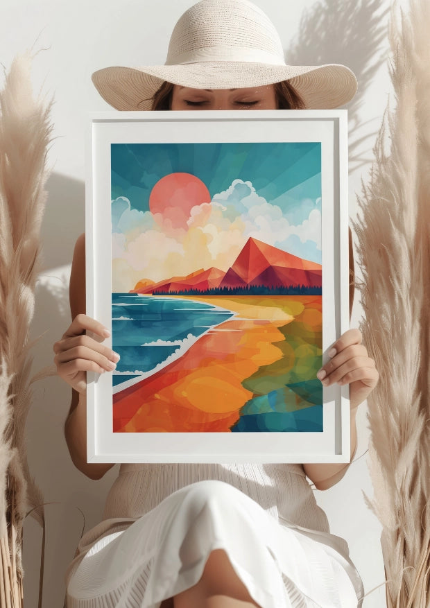Plakat "Barwne Góry nad Złotą Plażą" to doskonały wybór dla osób ceniących sztukę, która dodaje przestrzeni intensywności i charakteru. Wspaniale odnajdzie się w nowoczesnych wnętrzach, wprowadzając ciepło i pozytywną energię.Ożyw swoje ściany