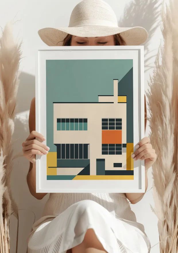 Ten plakat to hołd dla fundamentalnych zasad Bauhausu – prostoty, funkcjonalności i nowoczesnej elegancji. Przedstawiona architektura z geometrycznymi kształtami i harmonijnymi kolorami odzwierciedla czystość formy i praktyczność, które definiują ten artystyczny ruch. Delikatne odcienie zieleni i żółci, zestawione z intensywną pomarańczą, tworzą obraz pełen spokoju i wyważonej energii.