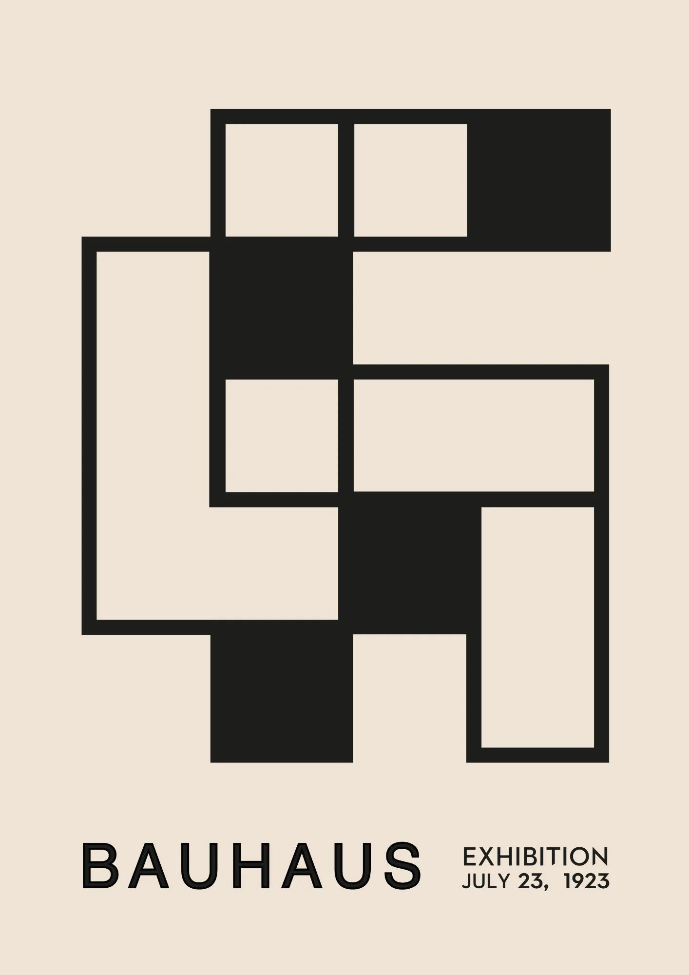 Ten plakat to wyjątkowa celebracja konstruktywizmu, którego minimalistyczna forma odzwierciedla założenia Bauhausu. Złożone z prostokątów i kwadratów kompozycje, precyzyjnie ułożone, tworzą harmonijną, a zarazem dynamiczną całość. Mocny kontrast między czernią a neutralnym tłem przyciąga wzrok i wprowadza do wnętrza nowoczesną elegancję.