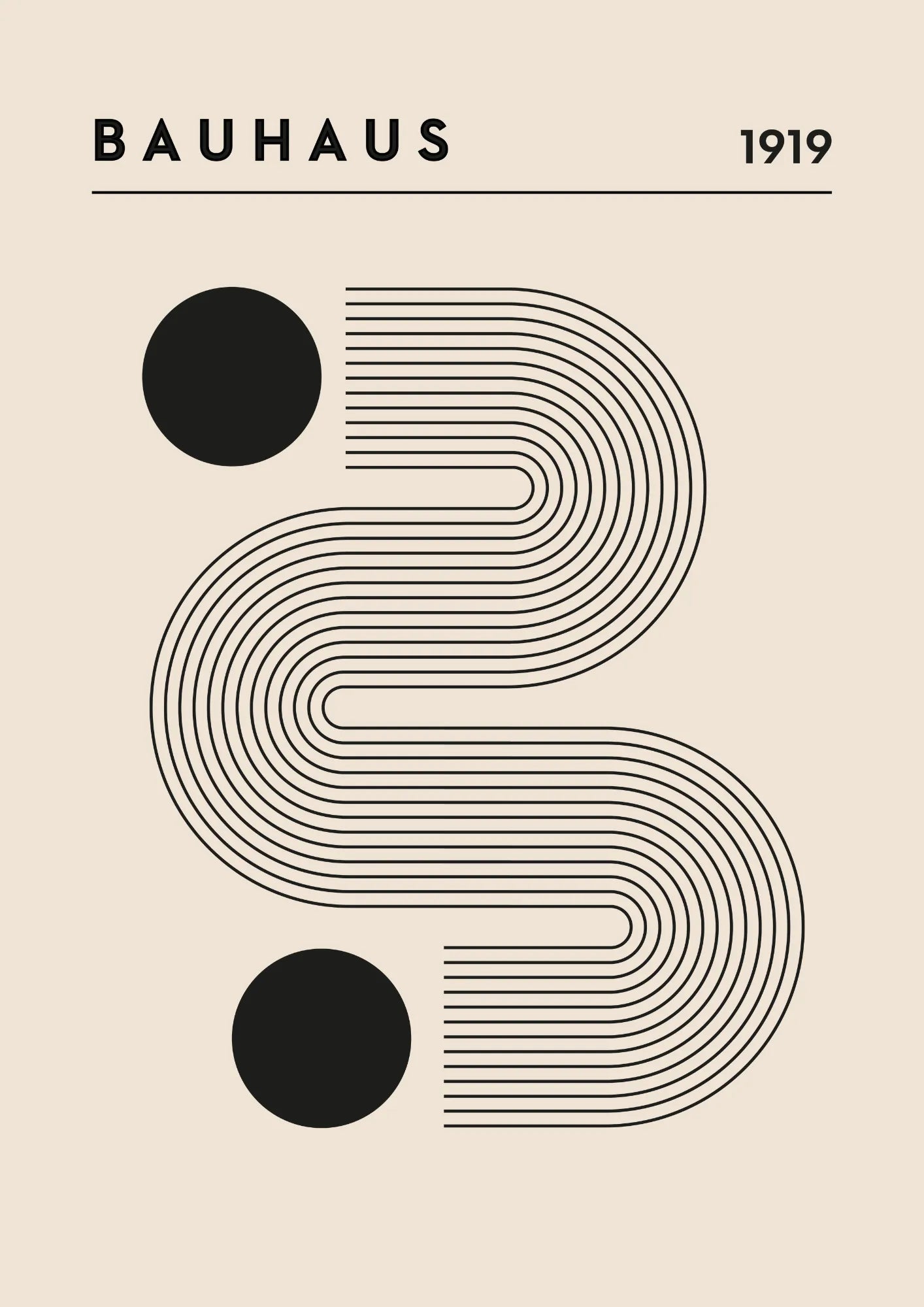 Oto plakat, który doskonale oddaje ducha Bauhausu poprzez minimalistyczny, ale zarazem wyrazisty design. Krzywizny linii tworzą dynamiczny, lecz harmonijny wzór, który przyciąga wzrok swoją prostotą i elegancją. Czarne, geometryczne formy na neutralnym tle podkreślają czystość idei Bauhausu – połączenie sztuki z funkcjonalnością.Symetria i rytm w harmonii