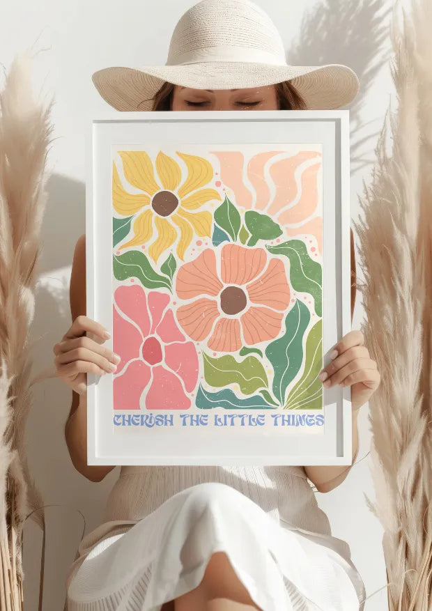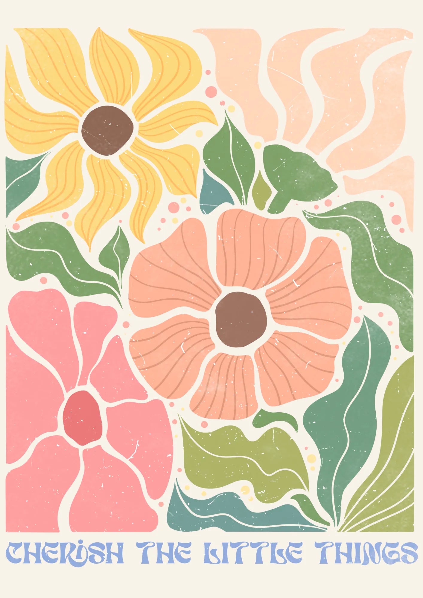 Plakat „Ciesz Się Małymi Rzeczami” przypomina, jak ważne jest docenianie drobnych chwil, które składają się na nasze życie. Kolorowe kwiaty, dynamicznie rozłożone na tle plakatu, symbolizują piękno i radość, które możemy odnaleźć w każdym dniu. Ten plakat jest celebracją prostoty i zachętą do zatrzymania się na moment, by dostrzec to, co naprawdę cenne.