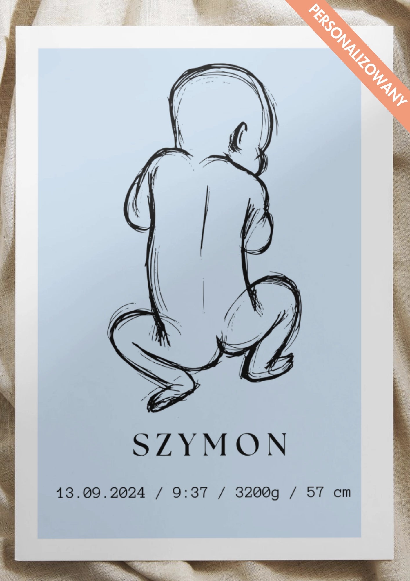 Delikatna ilustracja niemowlęcia na pastelowym, błękitnym tle wprowadza do wnętrza ciepło i spokój. Ręcznie szkicowana grafika i minimalistyczny styl sprawiają, że metryczka doskonale komponuje się z aranżacją dziecięcego pokoju, stając się jego uroczą ozdobą.Idealny prezent na narodziny, baby shower i chrzest