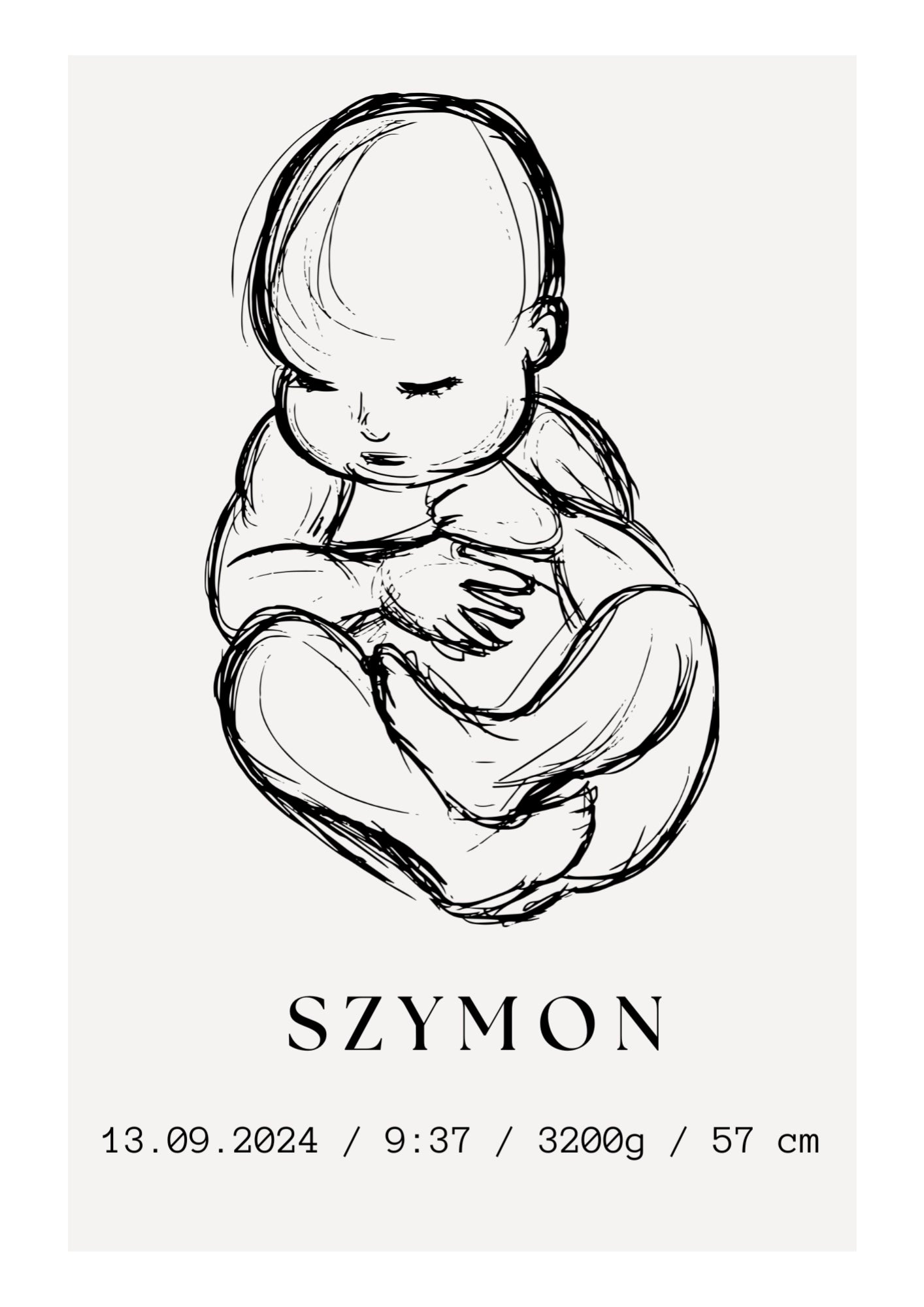 Ręcznie szkicowana ilustracja noworodka emanuje delikatnością i ciepłem. Dzięki subtelnym liniom i stonowanej kolorystyce metryczka doskonale komponuje się z każdym stylem wnętrza – od klasycznego pokoju dziecięcego po nowoczesne przestrzenie. To dekoracja, która dodaje wnętrzu wyjątkowego, rodzinnego charakteru.