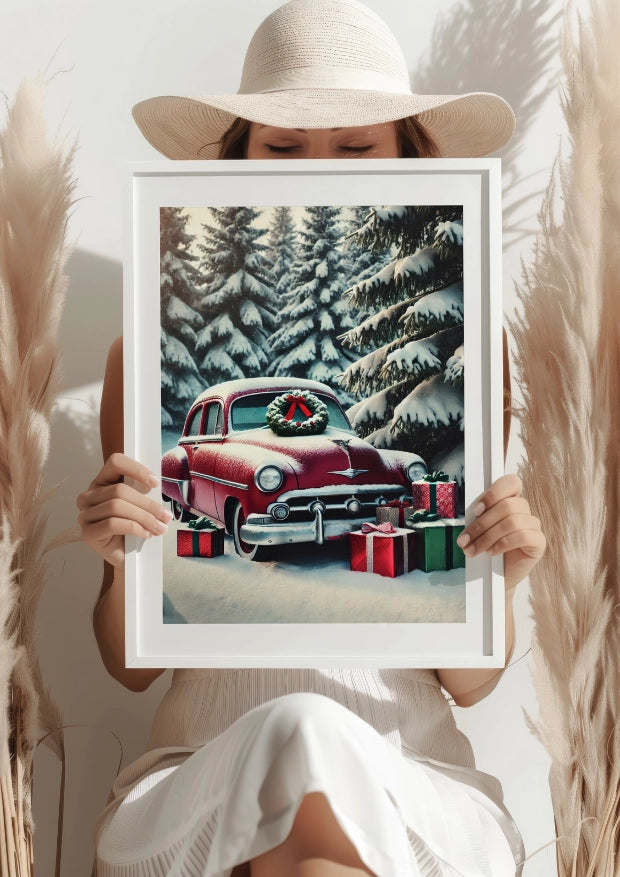 Wykonany z najwyższej jakości materiałów, plakat oferuje doskonałe odwzorowanie głębokich kolorów, które ożywiają scenę zimowego lasu z klasycznym samochodem udekorowanym wieńcem. Jest dostępny w różnych rozmiarach, aby idealnie wpasować się w każde wnętrze. Detale, takie jak opadły śnieg i błysk świątecznych prezentów, tworzą atmosferę, do której chętnie wracasz.Przekształć Swoją Przestrzeń w Świąteczną Krainę Czarów