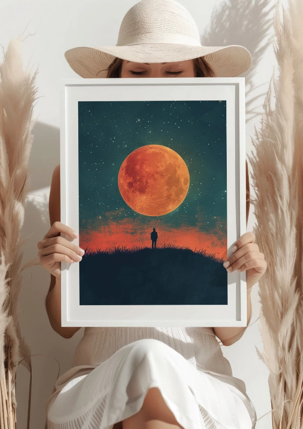 "Człowiek Pod Pełnią Księżyca" to plakat, który przenosi cię w świat tajemniczej i pełnej refleksji nocy. Zastanów się, jak będzie wyglądać Twoje wnętrze, kiedy wypełni je niesamowita poświata księżyca, który wisi nad horyzontem, oświetlając sylwetkę samotnego człowieka. Oto plakat, który stanie się sercem Twojego pokoju, przyciągając każdego spojrzenie swoją intrygującą harmonią kolorów.Wszechświat na Wyciągnięcie Ręki