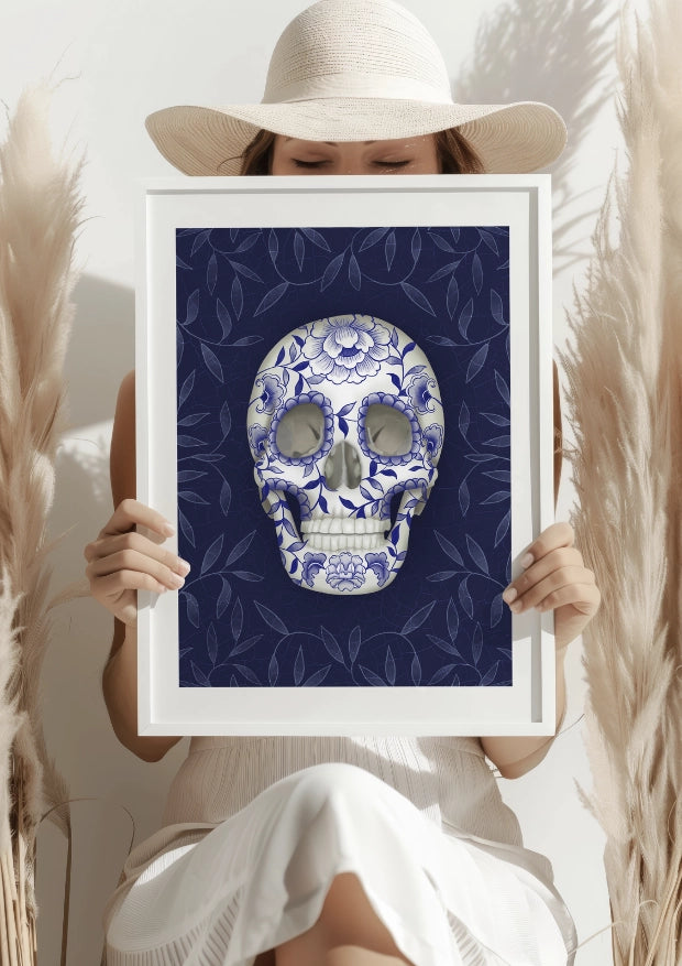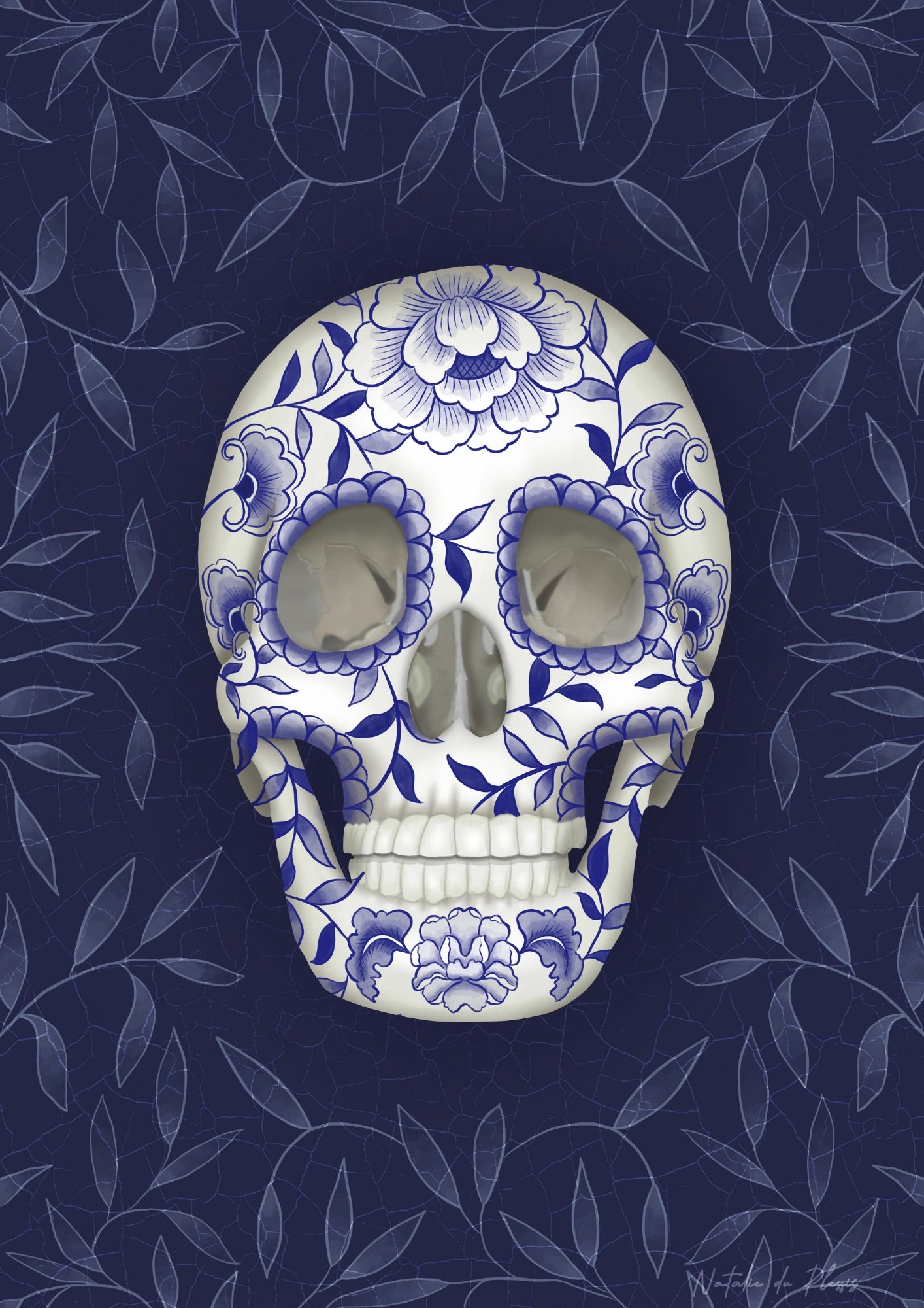 Ten plakat łączy w sobie kontrastujące motywy, tworząc niepowtarzalne połączenie klasyki i współczesnej estetyki. Niebieskie wzory inspirowane tradycyjną porcelaną kontrastują z motywem czaszki, tworząc zaskakujący efekt, który przyciąga uwagę.