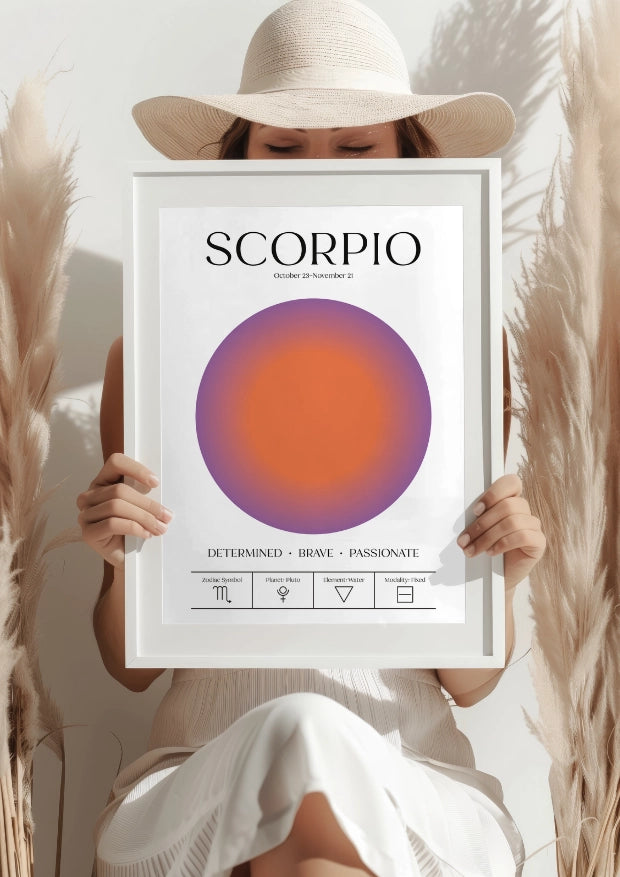 Przedstawiamy niezwykły plakat z aurą, inspirowany jednym z najpotężniejszych znaków zodiaku – Skorpionem. Subtelne, acz dynamiczne przejścia od ciepłych pomarańczowych barw do głębokiego fioletu symbolizują intensywność emocji i nieprzerwaną determinację, które definiują ten znak. Ta aura nawiązuje do wewnętrznej mocy i odwagi, jakie towarzyszą każdemu Skorpionowi.Potężny symbol odwagi i niezłomności