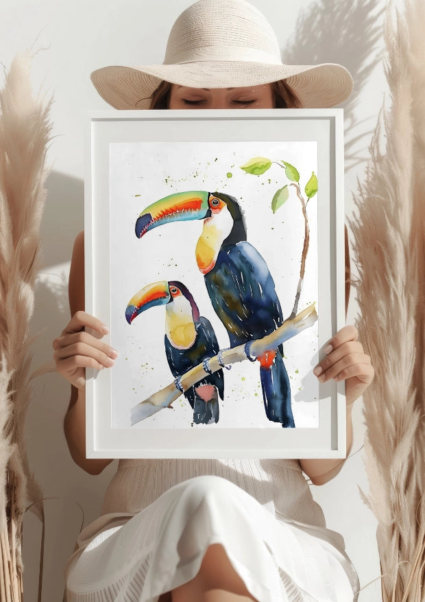 Przenieś się do tropikalnego raju za pomocą plakatu z dwoma majestatycznymi tukanami siedzącymi na gałęzi. Barwne dzioby tych egzotycznych ptaków rozświetlą każde pomieszczenie, a ich urok przyciągnie uwagę każdego gościa. Wysokiej jakości grafika, wykonana techniką akwareli, wspaniale oddaje różnorodność kolorów i detali natury.Idealna kompozycja dla miłośników dzikiej przyrody
