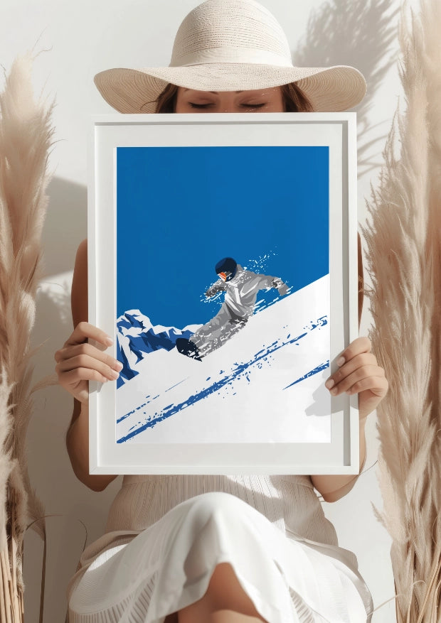 Plakat "Dynamiczny zjazd na snowboardzie" to ujęcie pełne adrenaliny i emocji. Snowboardzista mknie w dół stoku, zostawiając za sobą wirujący ślad świeżego śniegu. Niebieskie, jasne niebo i majestatyczne szczyty górskie w tle kontrastują z dynamiczną akcją w pierwszym planie, tworząc obraz pełen energii i ruchu.Idealny dla fanów sportów zimowych
