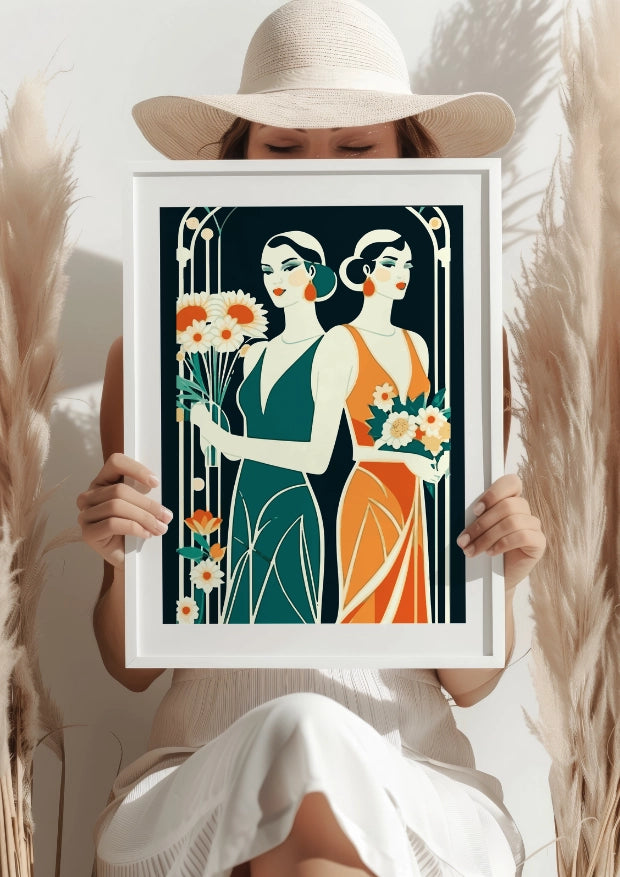 Eleganckie Kobiety z Bukietami w Stylu Art Deco Plakat
