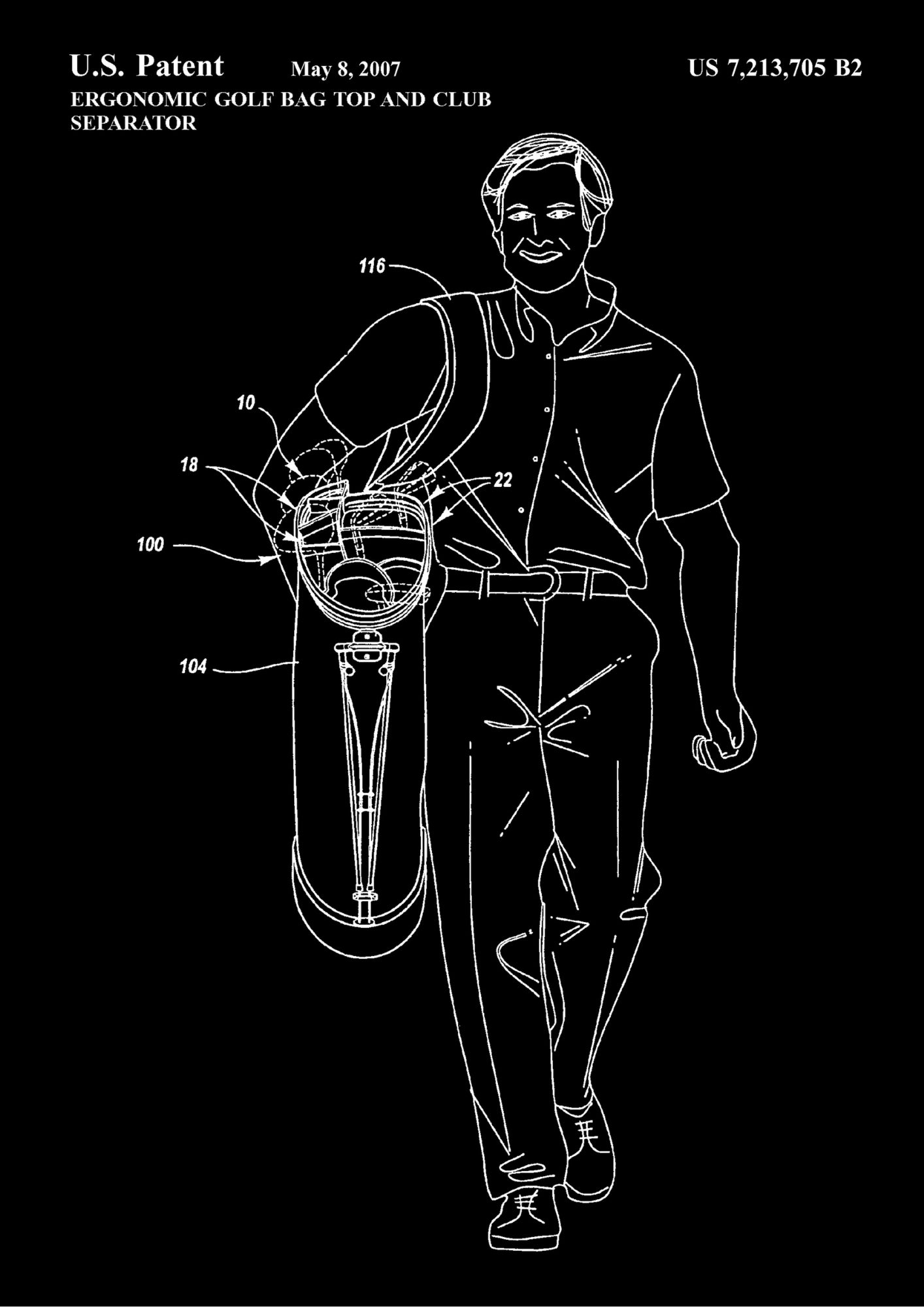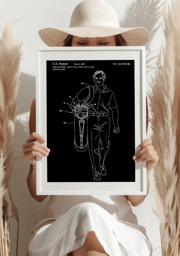 Ten plakat na czarnym tle prezentuje patent na ergonomiczną torbę golfową z separatorem kijów, podkreślając innowacyjność i funkcjonalność tego projektu. Kontrastowy rysunek techniczny ukazuje każdy detal torby, której konstrukcja została zaprojektowana z myślą o maksymalnej wygodzie noszenia i organizacji kijów golfowych.Praktyczność i nowoczesny design