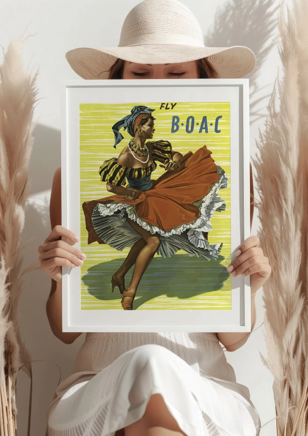 Ten plakat Fly BOAC zabiera nas w tropikalną podróż na Karaiby, gdzie taniec i muzyka wypełniają każdy dzień. Przedstawiona na nim tancerka w tradycyjnym, kolorowym stroju pełnym żywych barw symbolizuje bogatą kulturę wysp i ich energetyczną atmosferę.Taniec, Kolory i Tropikalny Klimat