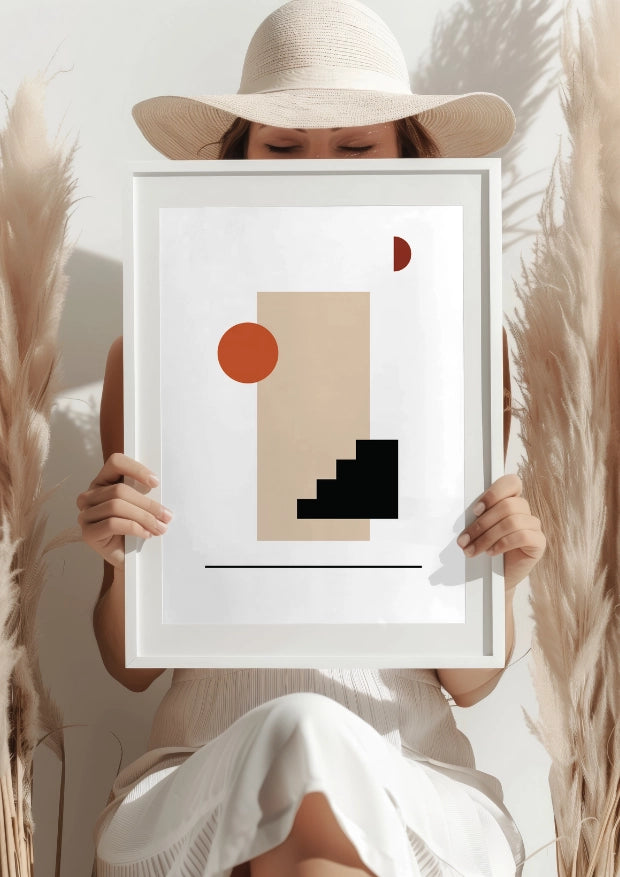 Abstrakcyjny plakat z wyrazistymi formami geometrycznymi, takimi jak schody, koło i półkole, wprowadza do wnętrza harmonię prostych linii i kształtów. Kolory o ciepłych, ziemistych tonach kontrastują z czarnymi elementami, tworząc wyrazistą kompozycję, która przyciąga wzrok. To sztuka, która przemawia prostotą, ale kryje w sobie głębię.Architektoniczne Inspiracje