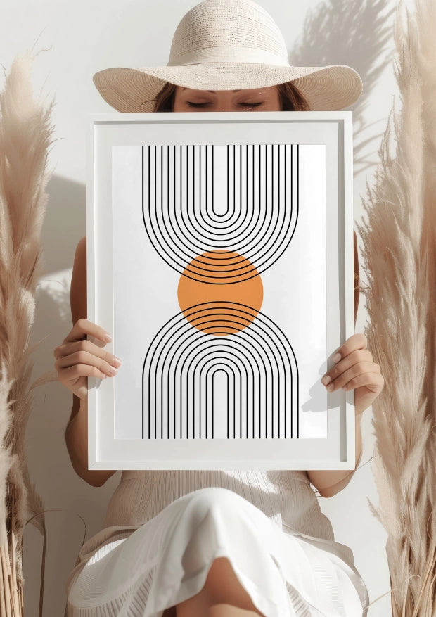 Ten geometryczny plakat zachwyca precyzyjnie prowadzonymi liniami, które spotykają się w centralnym punkcie, tworząc intrygujący wzór symetrii. Środek kompozycji ożywia pomarańczowy okrąg, który dodaje dynamizmu całej kompozycji, przyciągając wzrok i nadając całości wyjątkowy charakter.Nowoczesna sztuka w minimalistycznym wydaniu