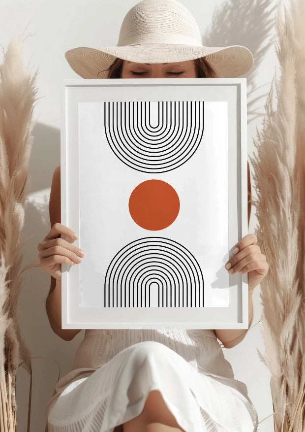 Plakat, który łączy geometryczne kształty z prostotą minimalizmu, jest idealnym dodatkiem do każdego wnętrza. W centralnej części dominuje intensywna czerwona kropka, kontrastująca z precyzyjnymi czarnymi liniami układającymi się w złożony, a jednocześnie harmonijny wzór. Jego nowoczesny design wprowadza do wnętrza spokój i równowagę, czyniąc go idealnym wyborem dla miłośników prostoty.Elegancja i Minimalizm w Jednym