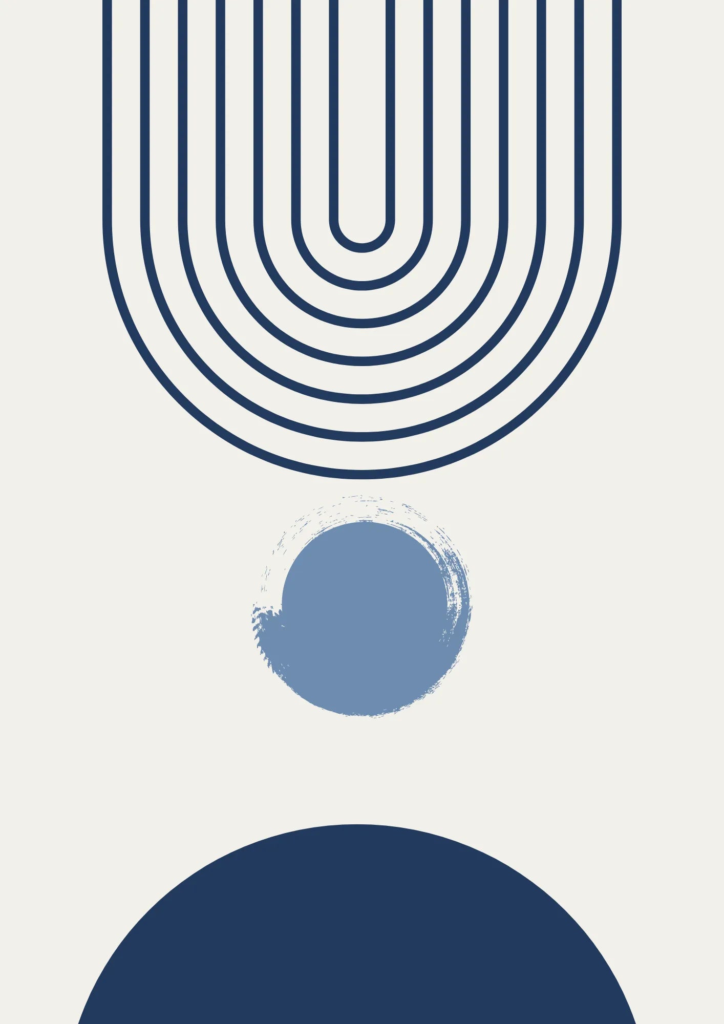 Na plakacie spotykają się różnorodne elementy geometryczne – od smukłych linii po koła, które wzajemnie się uzupełniają. Delikatne odcienie niebieskiego wprowadzają atmosferę spokoju i wyrafinowania, idealnie komponując się z nowoczesnymi wnętrzami.