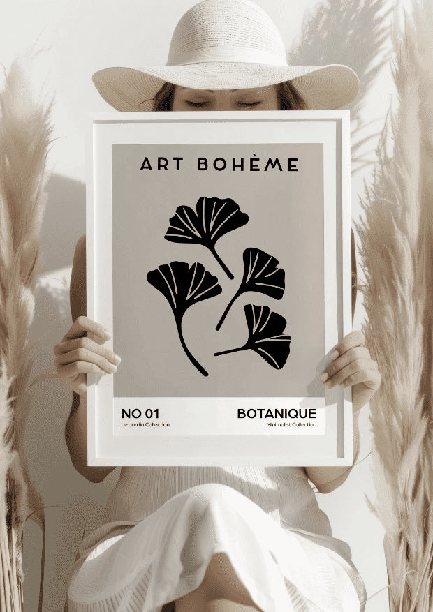 Plakat inspirowany subtelnym pięknem liści Ginkgo to doskonała propozycja dla miłośników prostoty i elegancji. Artystyczny design w odcieniach czerni i beżu podkreśla naturalne piękno rośliny, tworząc harmonijną i nowoczesną kompozycję, która dodaje wnętrzu lekkości i klasy.Inspiracja naturą i sztuką boho