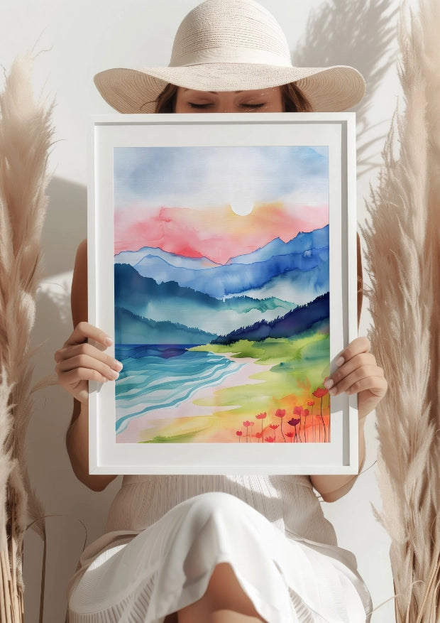 Plakat "Górski Poranek z Widokiem na Plażę" to subtelne połączenie górskiego krajobrazu i malowniczej plaży, skąpanych w ciepłych barwach wschodzącego słońca. Delikatne pasma gór, przechodzące od niebieskich po pastelowe odcienie różu i pomarańczu, doskonale kontrastują z lazurowym morzem i kwiatami w dolinie. Ten plakat przypomina poranek, gdy świat budzi się do życia w atmosferze spokoju i harmonii.