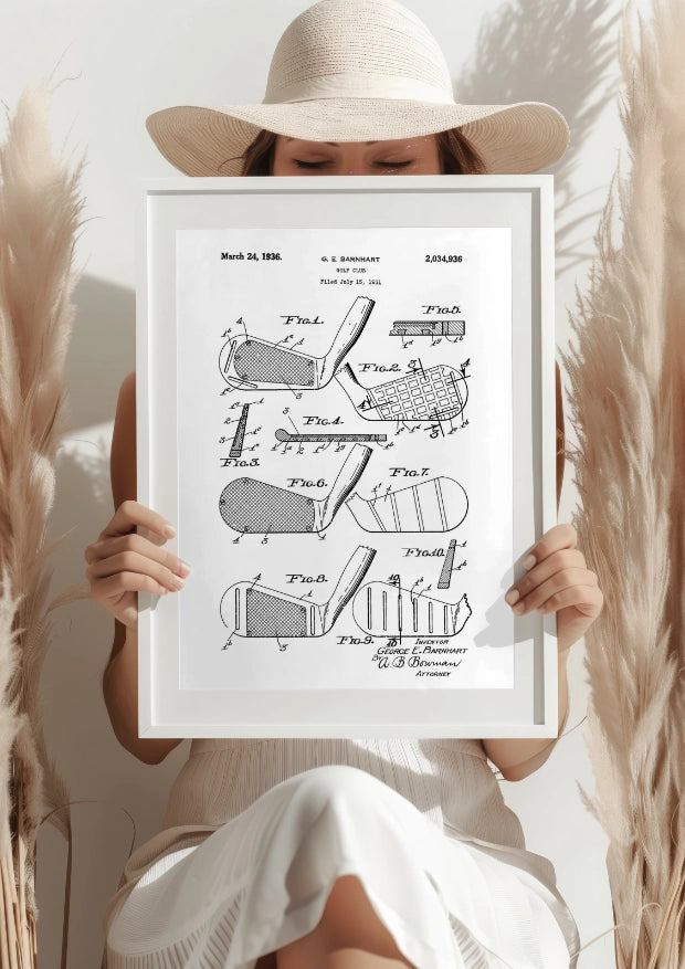 Ten plakat przedstawia patent na główkę kija golfowego z 1936 roku, który zrewolucjonizował sposób, w jaki golfiści kontrolują swoje uderzenia. Przedstawione szczegóły techniczne i unikalne innowacje, takie jak siatka w strukturze główki, są dowodem na inżynierską precyzję tamtych czasów.Precyzja i kontrola dla każdego golfisty