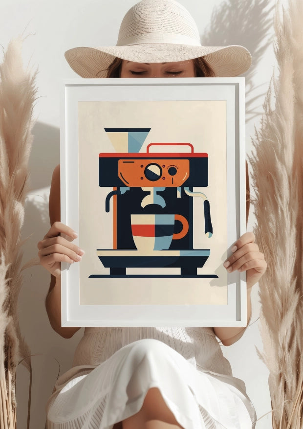 Zastosowane kolory i geometryczne kształty tworzą niepowtarzalny design pełen harmonii. Plakat przedstawia ekspres do kawy w artystycznym ujęciu, podkreślając pasję do porannych rytuałów. Druk wysokiej jakości gwarantuje trwałość i intensywność barw, które będą cieszyć oczy przez lata.Codzienność pełna inspiracji
