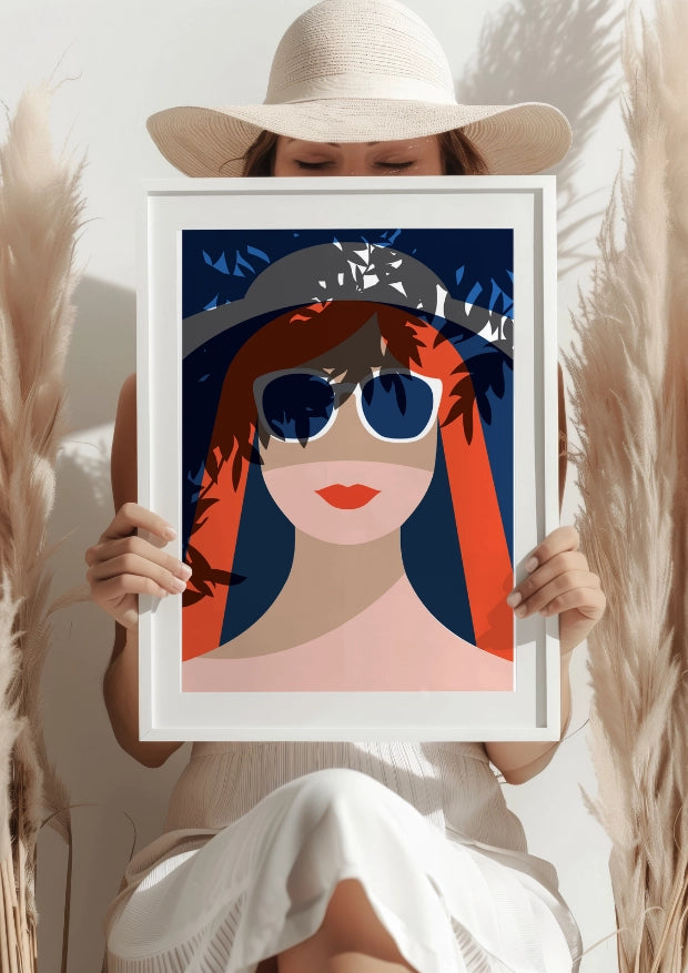 Plakat "Kobieta w Okularach i Kapeluszu" przedstawia postać tajemniczej kobiety, której twarz skrywa cień eleganckiego kapelusza i kontrastujące z nim, jasne okulary przeciwsłoneczne. Minimalistyczny styl i głęboki granat tła przyciągają uwagę, tworząc aurę wyrafinowania i klasy, która wniesie do Twojego wnętrza nutę modowego szyku.Kontrast barw podkreślający indywidualność