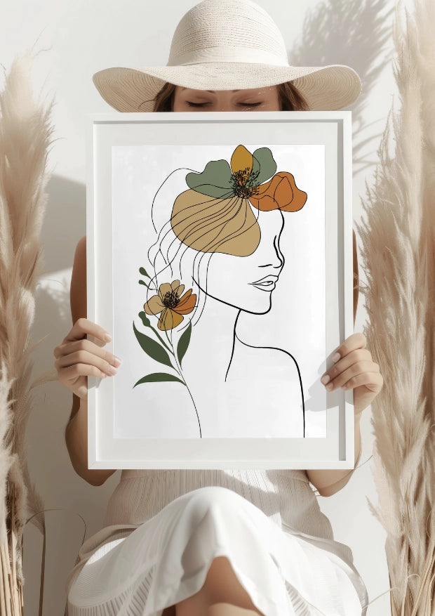 Kwiaty stanowią centralny element plakatu, subtelnie przenikając się z linią twarzy, co tworzy głęboki i wyrafinowany efekt. Kolory pomarańczy, zieleni i beżu wnoszą ciepło i spokój, doskonale wkomponowując się w każde wnętrze.Dodaj nutę natury do swojego wnętrza