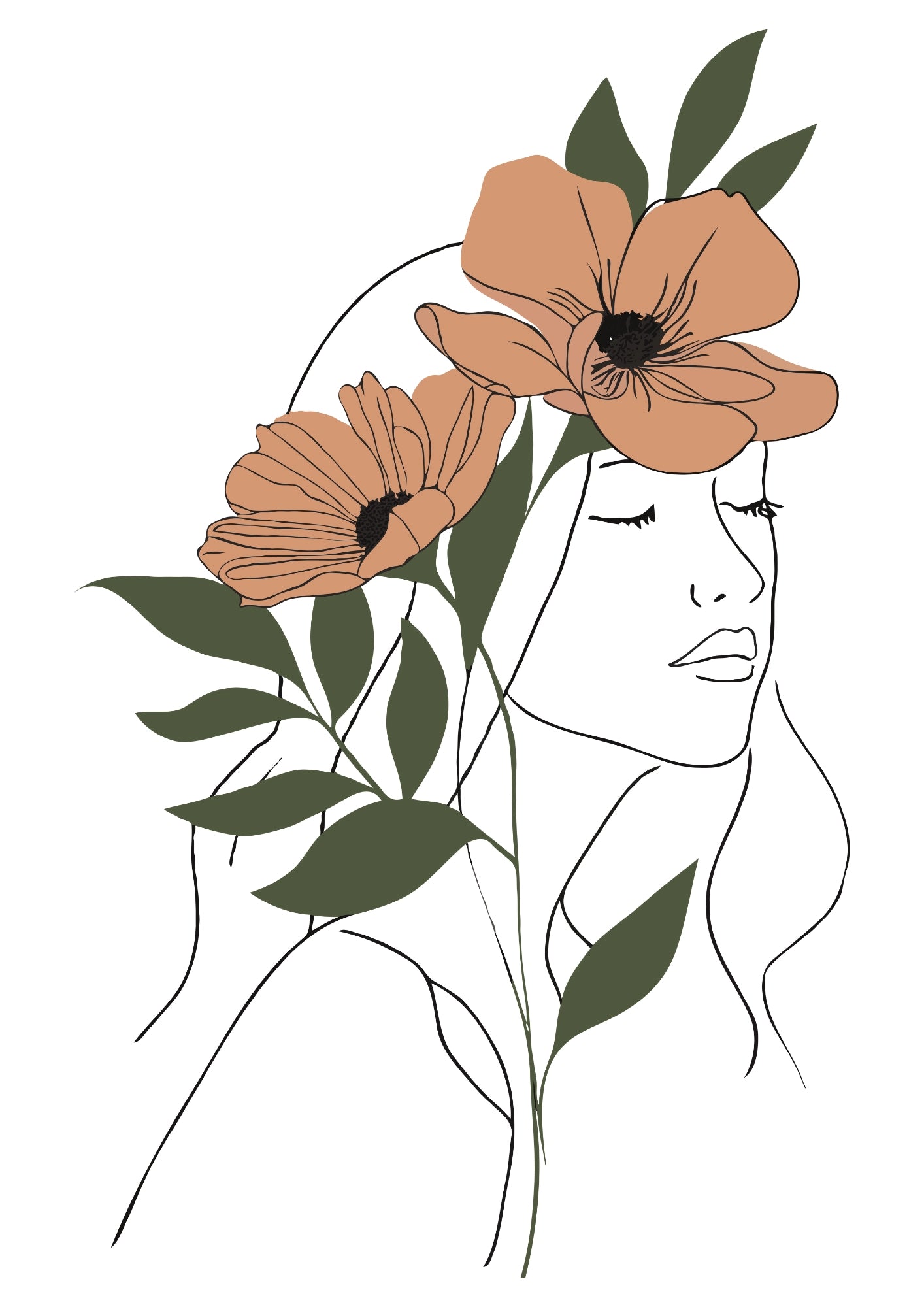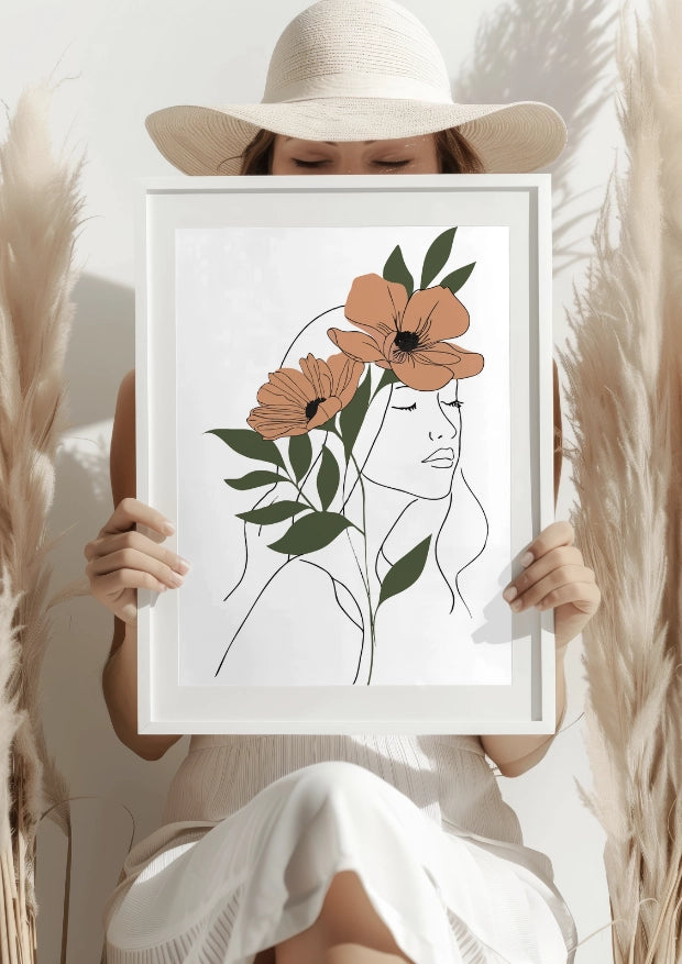 Minimalistyczny styl rysunku sprawia, że każdy szczegół staje się bardziej wyrazisty. Kwiaty zdobiące głowę kobiety to symbol odradzającej się natury, a ich spokojne, stonowane barwy wprowadzają harmonię i równowagę do Twojego wnętrza. Połączenie natury i kobiecej delikatności tworzy wyjątkowy efekt.Idealny Akcent Dekoracyjny