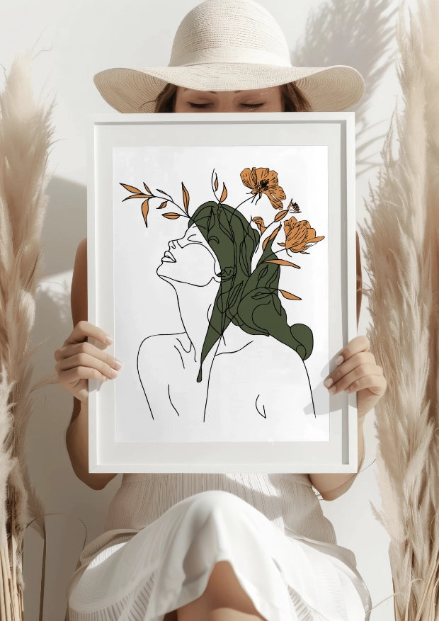 Ten plakat przyciąga uwagę swoją elegancką prostotą i głębokim przekazem. Delikatna sylwetka kobiety z zatopionymi w myślach rysami, opleciona pięknymi, pomarańczowymi kwiatami, tworzy harmonijną kompozycję, która łączy subtelność z naturą. Zieleń włosów symbolizuje połączenie z ziemią i naturalnym pięknem.Kwiaty, które opowiadają historię