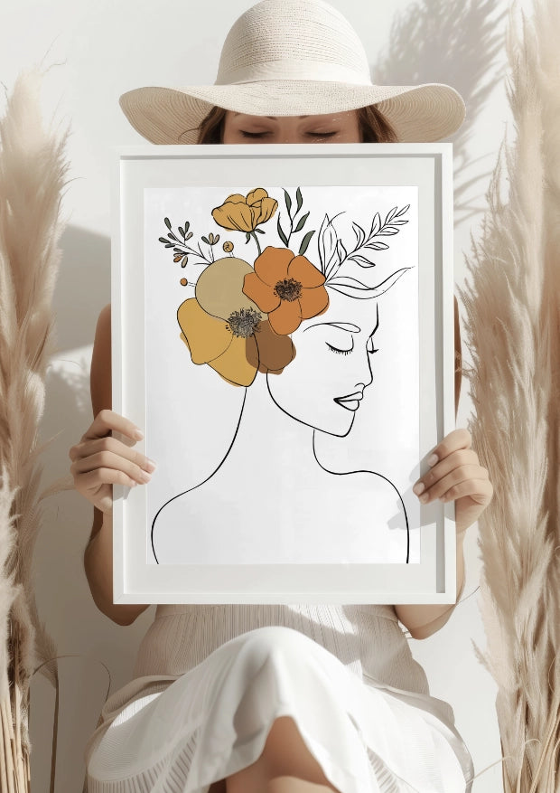 Plakat przedstawiający minimalistyczną linię kobiecej twarzy z kwiatowym wieńcem w odcieniach ciepłych, jesiennych barw to połączenie elegancji i harmonii natury. Każdy kwiat na wieńcu opowiada swoją historię, tworząc spójną kompozycję pełną wdzięku i delikatności.Artystyczna interpretacja natury i piękna