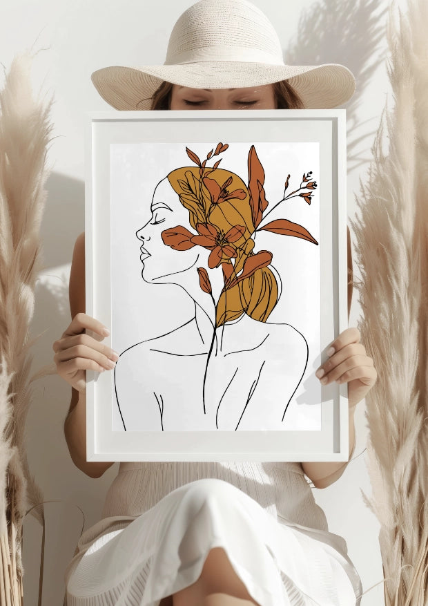 Zanurz się w świecie subtelnego piękna z tym minimalistycznym plakatem, który łączy delikatną kobiecą sylwetkę z kwiatami w odcieniach jesieni. Prosta linia rysunku przyciąga uwagę, a jednocześnie emanuje spokojem i harmonią, przywołując wspomnienia złotych, słonecznych dni.Symbolika Natury i Wewnętrznego Piękna