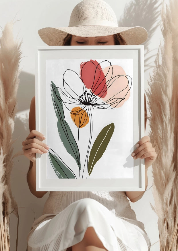 Ciepłe, pastelowe odcienie różu, żółci i zieleni subtelnie kontrastują z prostymi, czarnymi liniami, tworząc balans pomiędzy sztuką a naturą. Ten plakat idealnie sprawdzi się w nowoczesnych i minimalistycznych wnętrzach, nadając im artystyczny charakter.Sztuka, Która Przemawia do Wyobraźni