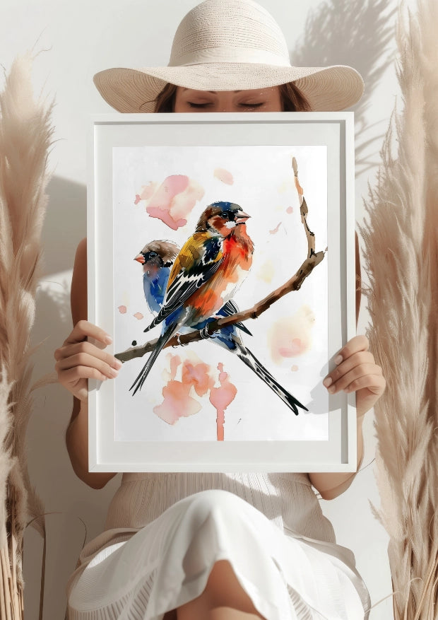Przenieś atmosferę wiosennego poranka do swojego domu za pomocą plakatu przedstawiającego dwa piękne, kolorowe ptaki siedzące na gałęzi. Ciepłe barwy piór i delikatne, akwarelowe tło tworzą harmonijną kompozycję, która wprowadza spokój i naturalną energię do każdego pomieszczenia. Ten plakat to idealny wybór dla miłośników przyrody, którzy pragną dodać swojemu wnętrzu nieco życia i koloru.Delikatność i żywiołowość w jednym obrazie