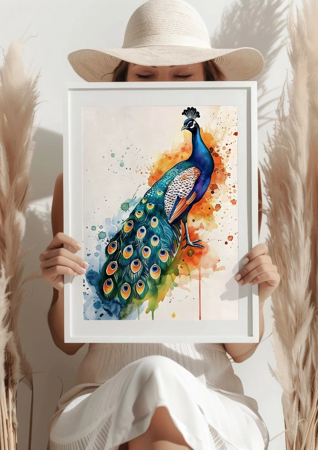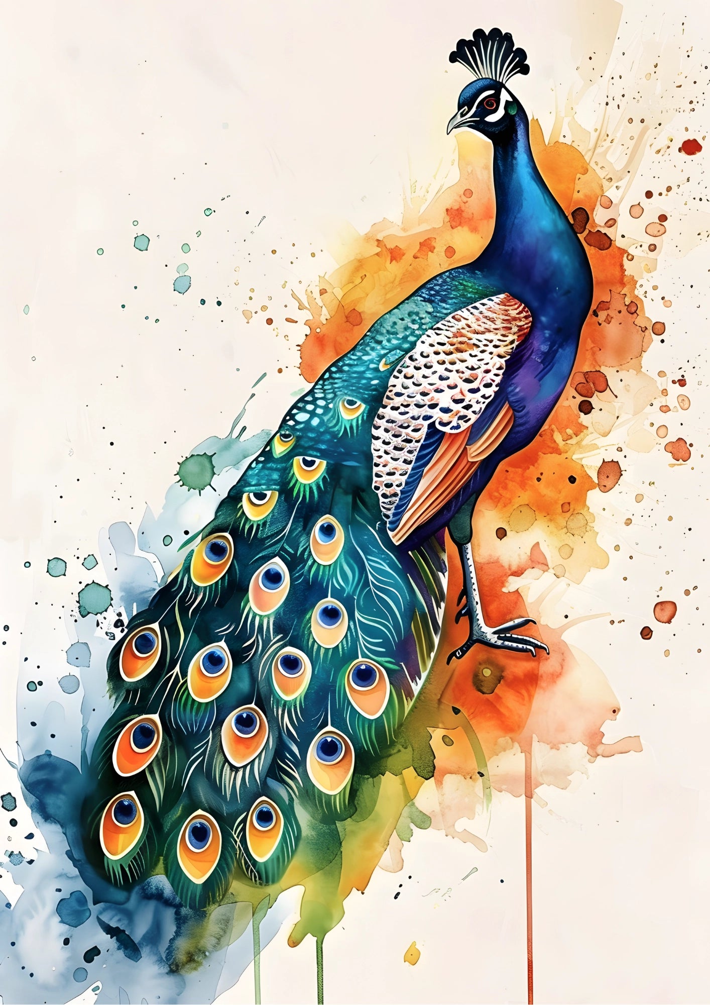 Plakat inspirowany techniką akwarelową to doskonałe połączenie sztuki i natury. Barwne plamy tła kontrastują z precyzyjnym rysunkiem pawia, co nadaje obrazowi dynamiki i lekkości. To idealny wybór dla miłośników wyrazistych dekoracji wnętrz, które przyciągają wzrok i wnoszą energię do przestrzeni.