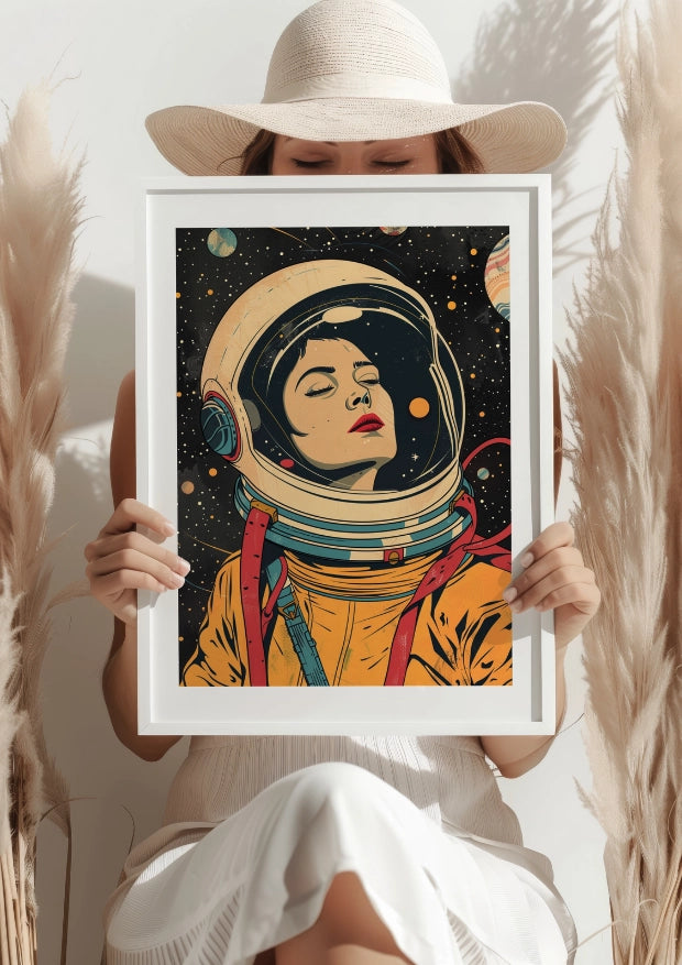 Zanurz się w tajemnicze światy i nieznane galaktyki dzięki naszemu wyjątkowemu plakatowi "Kosmiczna Podróż Kobiety". Ten inspirowany sztuką retro obraz przeniesie Cię poza granice Ziemi, prosto do serca gwiazd. Idealne połączenie sztuki i nieograniczonej wyobraźni, aby ożywić każdą przestrzeń w Twoim domu.Zanurzenie w Kosmicznej Rzeczywistości