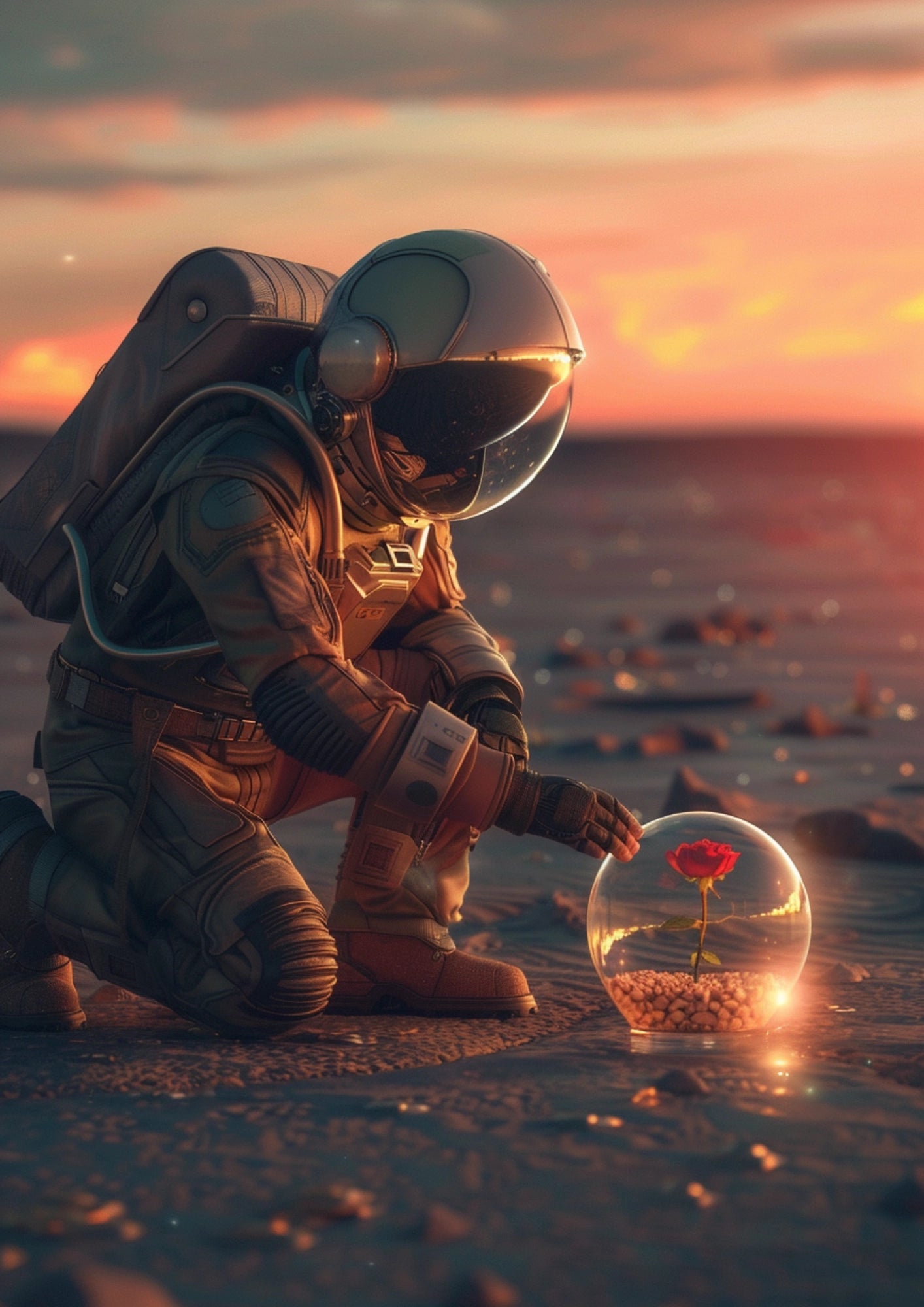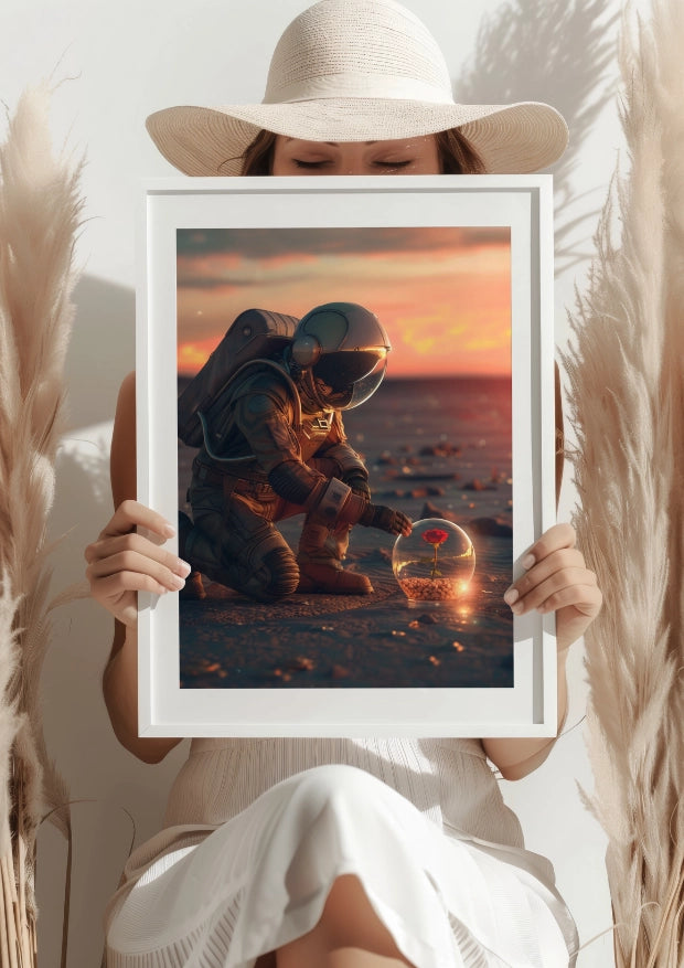 Wykonany z najwyższej jakości materiałów, plakat zachwyca detalem i głębią kolorów. Idealny do każdego wnętrza, dodaje elegancji i innowacyjności. Postać astronauty przyglądająca się delikatnej róży w kuli to symbol odkrywania nowych światów i uporczywego dążenia do piękna nawet w najbardziej nieoczekiwanych miejscach.Wzbudź Emocje i Inspirować
