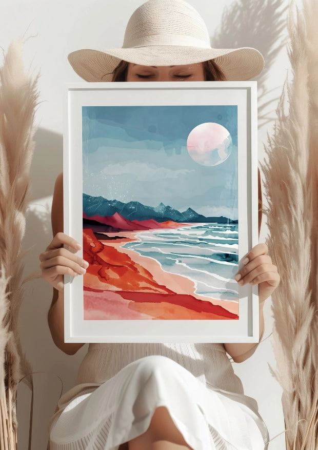 Intensywne odcienie czerwieni, błękitu i różu harmonizują ze sobą, tworząc obraz pełen kontrastów i emocji. Fale delikatnie rozbijające się o brzeg przyciągają wzrok, a oświetlone góry dodają całości mistycznego nastroju. Ten plakat to dzieło sztuki, które ożywi każdą przestrzeń.Idealny dodatek do Twojego wnętrza