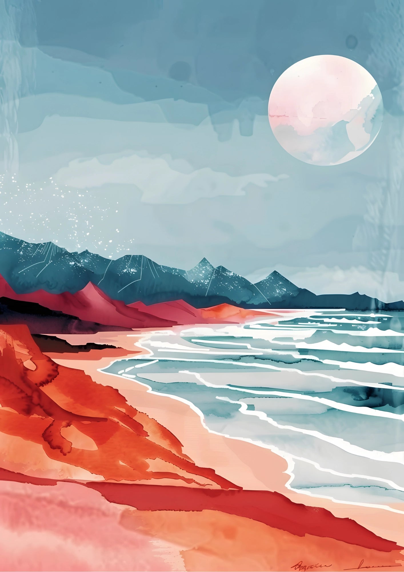 Plakat "Księżycowy Pejzaż Górski nad Brzegiem Morza" to zaproszenie do świata, gdzie góry spotykają się z oceanem, a niebo oświetla tajemniczy blask księżyca. Ta kompozycja malarska emanuje spokojem i magią, przenosząc Cię w miejsce, gdzie natura odkrywa swoje najbardziej subtelne piękno.Niezwykłe połączenie barw i kształtów