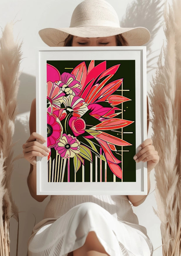 Plakat "Kwiatowa Ekspresja" to połączenie intensywnych różowych odcieni z wyrafinowaną geometrią i subtelną elegancją. Kwiaty w odcieniach różu i czerwieni, otoczone dynamicznymi liśćmi, tchną życie w przestrzeń, nadając jej unikalny, artystyczny charakter. To idealny wybór dla osób, które chcą wyróżnić swoje wnętrze odważnym akcentem.
