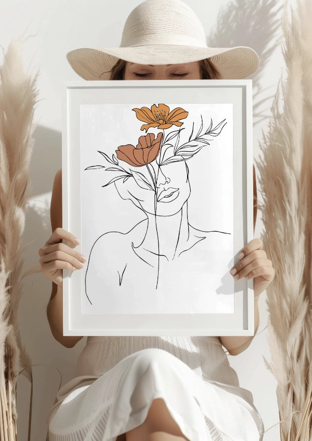 Plakat "Kwiatowa Twarz Kobiety" to delikatna linia łącząca subtelność kobiecej twarzy z naturalnym pięknem kwiatów. Minimalistyczna kreska w połączeniu z nasyconymi barwami kwiatów tworzy dzieło, które emanuje spokojem i elegancją.Symbol kobiecości i natury