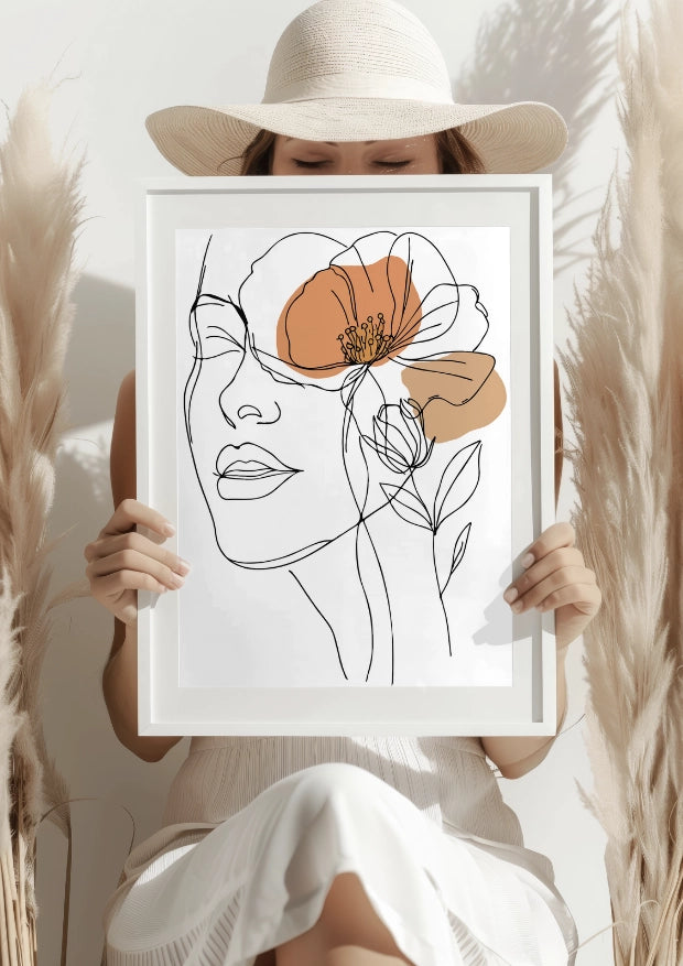 Ten plakat "Kwiatowa Twarz" to wyjątkowe połączenie subtelnej kreski z delikatnymi, pastelowymi akcentami. Przedstawia twarz kobiety ozdobioną kwiatami, tworząc kompozycję, która zachwyca swoją prostotą i elegancją. To idealna dekoracja dla miłośników minimalistycznej sztuki, która jednocześnie wyraża delikatność i wyrafinowanie.