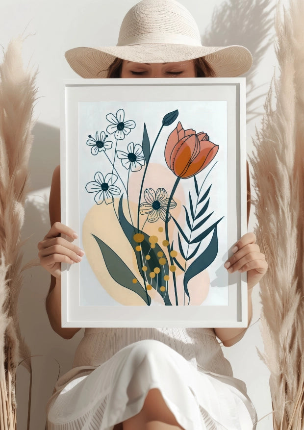 Ten plakat łączy delikatność naturalnych kształtów z nowoczesnym minimalizmem, tworząc harmonijną kompozycję, która dodaje wnętrzu elegancji i spokoju. Subtelne pastelowe tło stanowi idealne dopełnienie kontrastujących, ręcznie rysowanych kwiatów.Wiosenny Oddech Każdego Dnia