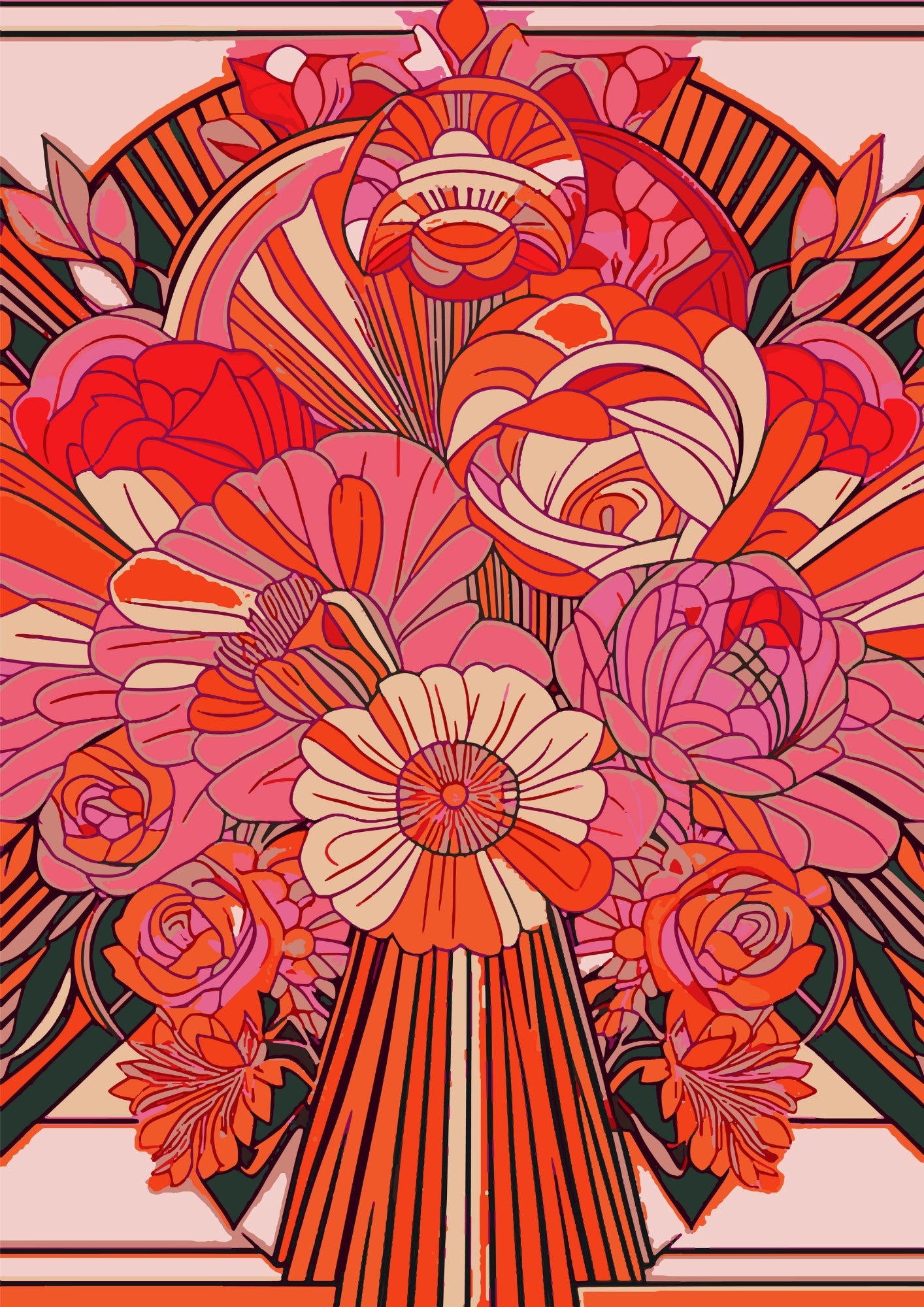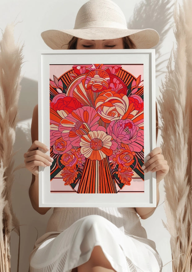 Wyjątkowe zestawienie geometrycznych wzorów i kwiatowych motywów w stylu retro tworzy niepowtarzalny klimat. Każdy szczegół opowiada historię o harmonii natury i sztuki. Plakat ten przyciągnie uwagę i stanie się centralnym punktem w każdym pomieszczeniu.