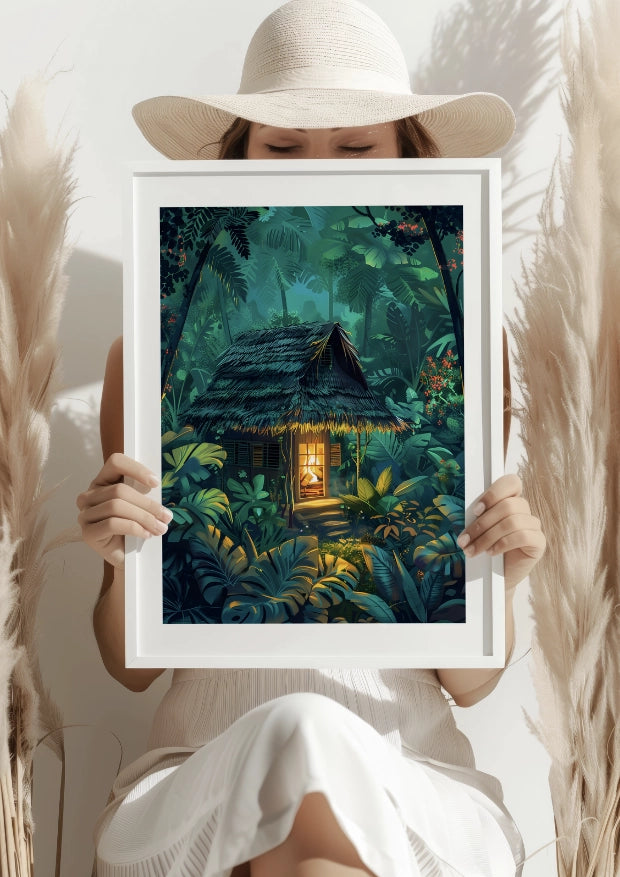 Oto plakat, który przenosi Cię w serce egzotycznej dżungli. Mała, urokliwa chata, oświetlona ciepłym blaskiem ognia, wyłania się spośród bujnych, zielonych liści tropikalnych roślin. Ten obraz przypomina o spokojnym schronieniu, gdzie cisza natury i szum liści stają się tłem codziennego życia. Idealny wybór dla miłośników przyrody, którzy pragną odrobiny egzotyki w swoim domu.Zanurzenie w naturze