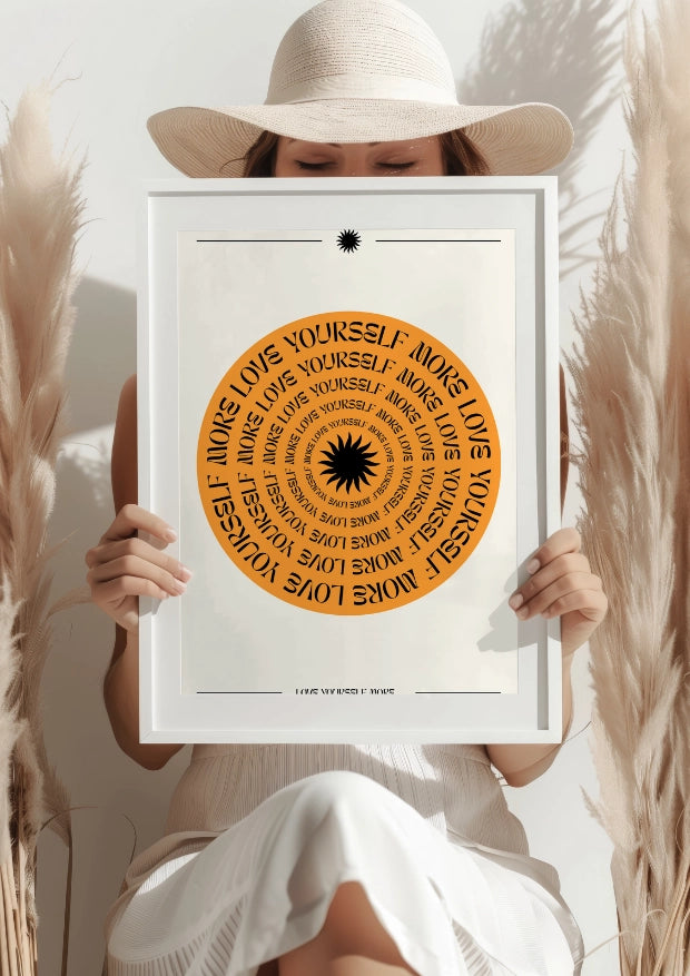 Codziennie przypominaj sobie o swojej wartości dzięki plakatowi „Love Yourself More.” Hipnotyzujący okrągły wzór prowadzi Cię do centrum, gdzie czeka na Ciebie najważniejsze przesłanie: „Pokochaj siebie bardziej.” Stylowa czcionka oraz nasycony żółty kolor sprawiają, że ten plakat staje się nie tylko dekoracją, ale i osobistym mantrą, która towarzyszy Ci każdego dnia.